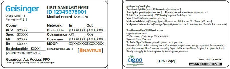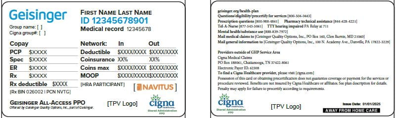 ID cards above are not inclusive of all Geisinger Health Plan ID card types. Geisinger Health Plan ID cards will include the Cigna Healthcare logo and claim submission information, when applicable. Self-funded plan sponsor ID cards may contain the plan sponsor logo.